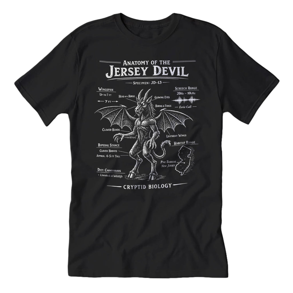Forget the state bird—study the anatomy of the real ruler of the Garden State. The Anatomy of the Jersey Devil T-Shirt treats the Pine Barrens legend with the scientific respect it deserves, breaking down "Specimen JD-13" from its leathery wings to its cloven hooves. It’s a field guide for the local cryptozoologist who knows that the woods are never truly empty.