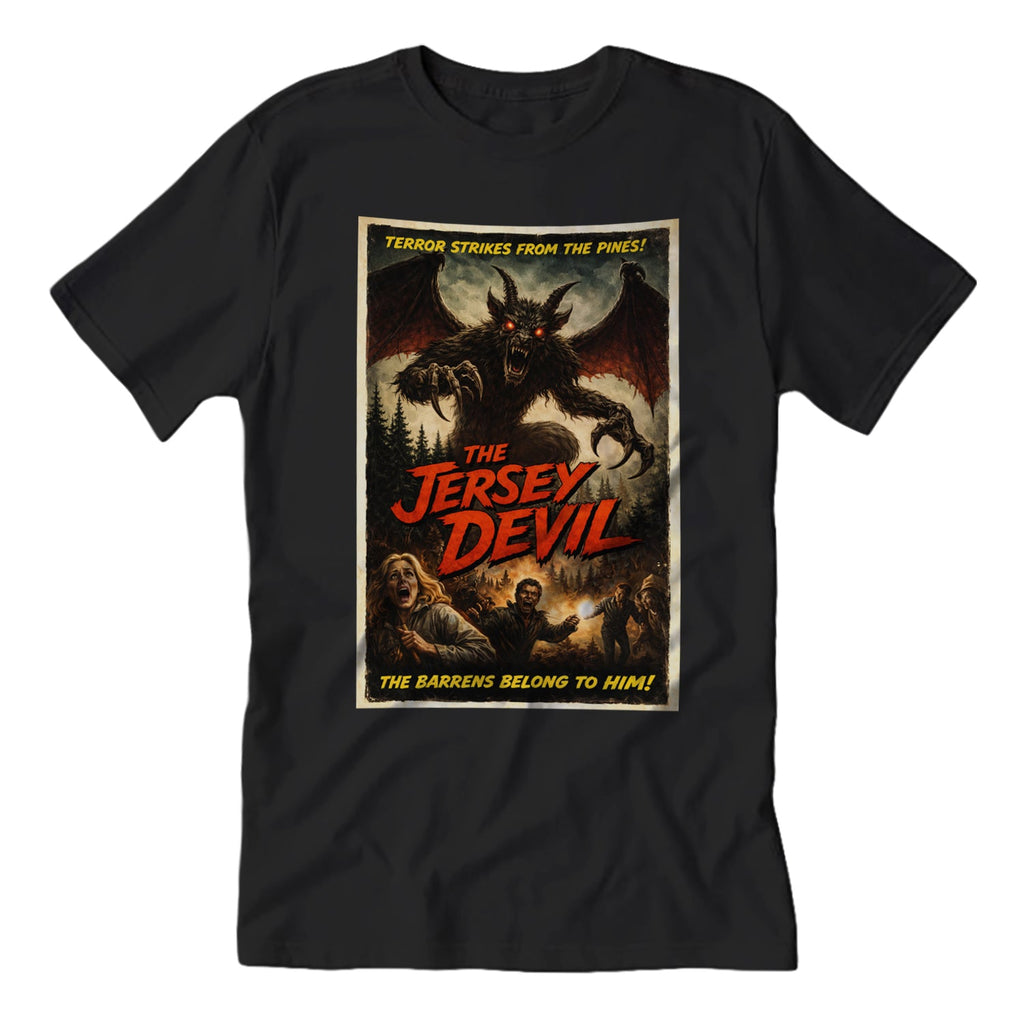 Turn the Garden State legend into a feature presentation with the Jersey Devil Horror Movie Poster T-Shirt. This full-color design looks straight out of a drive-in theater lobby, featuring the beast towering over terrified campers with the tagline "The Barrens Belong to Him." It’s a cinematic tribute to the ultimate New Jersey nightmare.