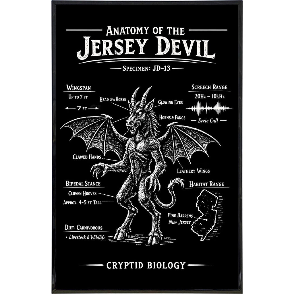 The "Anatomy of the Jersey Devil" Print treats the Leeds Devil like a real specimen. Designed with a stark, scientific "chalkboard" aesthetic, it details the terrifying traits that have spooked campers for centuries—from the "Head of a Horse" to the "Cloven Hooves." It even includes a habitat map highlighting South Jersey, so you can show exactly where the legend lives.
