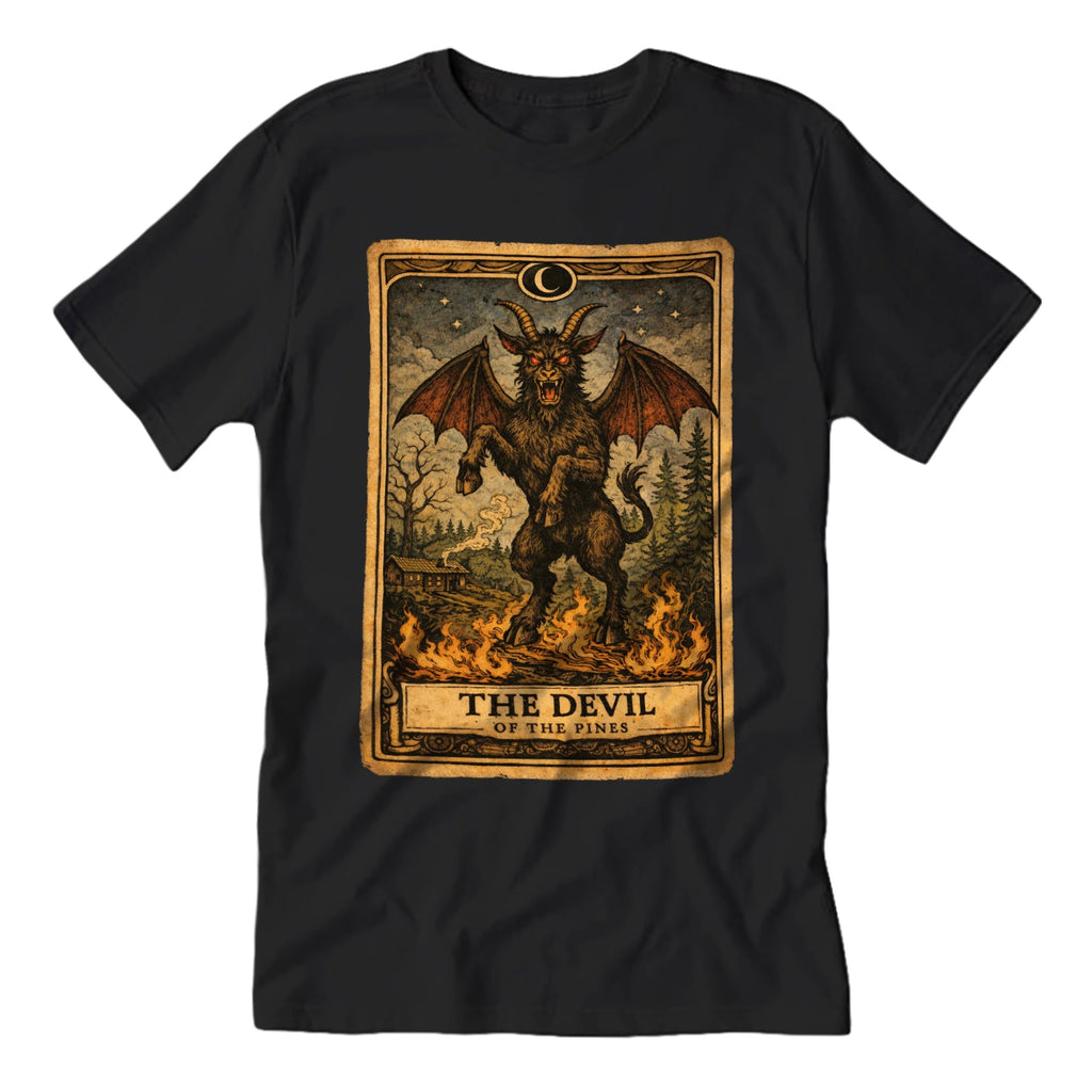 Deal yourself a legendary hand with the Jersey Devil Tarot Card T-Shirt. Reimagining the 13th Child as a mystical archetype, this design features the "King of the Pines" rising from the flames under a crescent moon. With its warm, antique color palette and intricate linework, it captures the eerie beauty of the deep woods.